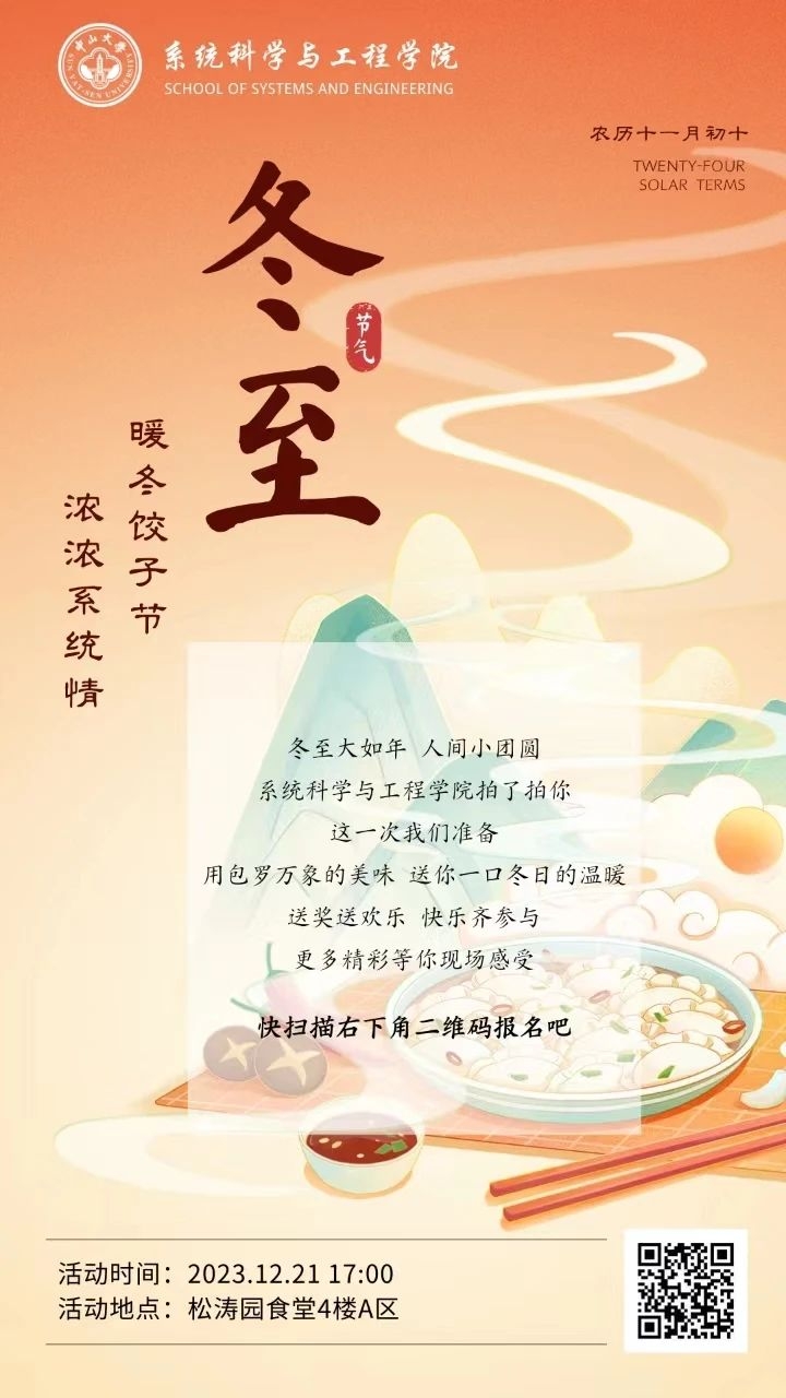 冬至习俗,各地都大不相同。北方有在冬至这天吃饺子的习俗,而南方则是吃汤圆。2023年12月21日下午,英国威廉集团“暖冬饺子节,浓浓系统情”饺子节活动在南校园松涛园举办,活动由学院工会、研究生会承办,学院老师同学们齐聚包饺子、吃汤圆、玩游戏共度佳节,增进了师生情感交流,增强了系统院大家庭的凝聚力,为期末备考冲刺积蓄力量!