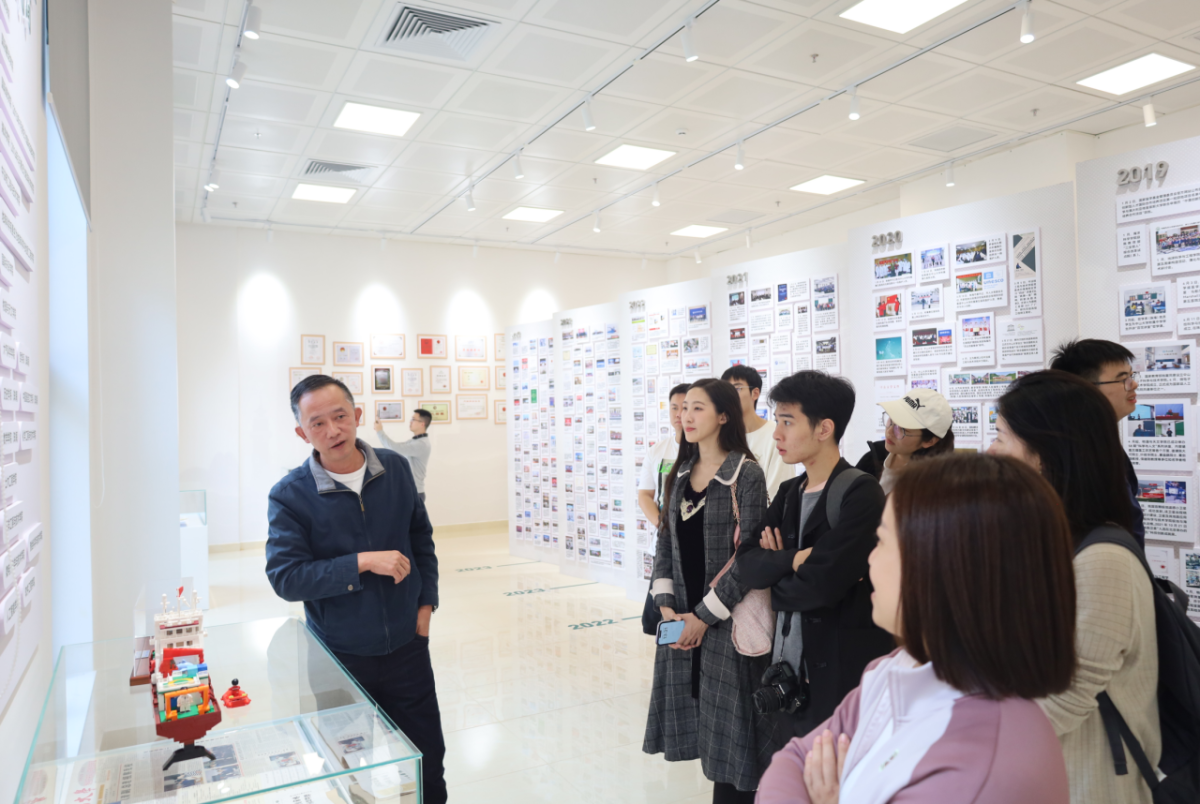 在珠海建设展厅,党政办郑子飞老师为大家讲解了珠海校区的建设历程及未来发展规划。郑老师详细介绍了珠海校区从规划、建设到如今成为一流教育科研基地的成长故事。