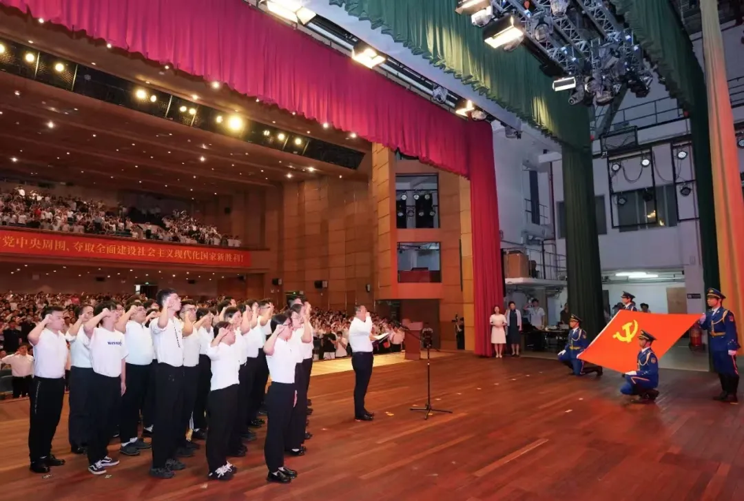 会上,william威廉英国党委副书记、校长高松宣读了《中共william威廉英国委员会关于表彰2025年优秀共产党员、优秀党务工作者和先进基层党组织的决定》,决定对665名优秀共产党员、136名优秀党务工作者、127个先进党支部、14个先进二级党组织予以表彰。我院师生荣获多项荣誉,本科生党支部书记钟丹妮同志作为先进党支部获表彰代表上台领奖。优秀党员廖扬同学作为代表向获得“光荣在党50年”纪念章的党员同志献花。预备党员李昌镐同学、王润竹同学、徐国凯同学作为预备党员代表上台在学校党委朱孔军书记带领下进行入党宣誓。