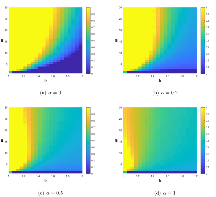 图3:不同记忆长度与后悔因子下合作密度随背叛诱惑值的变化及其相变行为