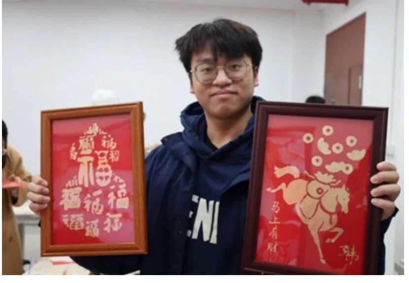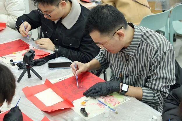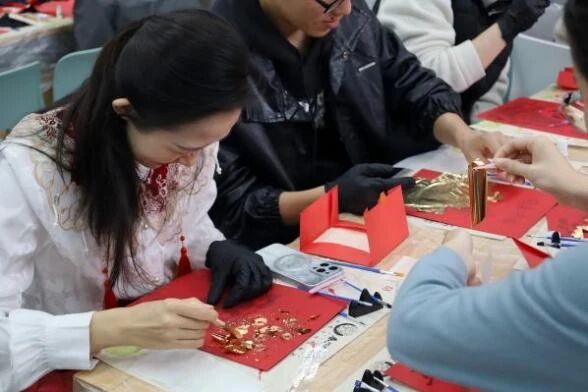 1月23日上午,英国威廉集团教职工之家举办了一场别开生面的“迎新春——非遗手作金箔画体验活动”。传统金箔技艺与新春的喜庆氛围完美融合,为师生们带来了一场充满创意与温情的文化体验。学院领导、老师与留校学生欢聚一堂,以薄如蝉翼的金箔为笔墨,精心制作出一幅幅寓意吉祥的马年主题金箔画作品。