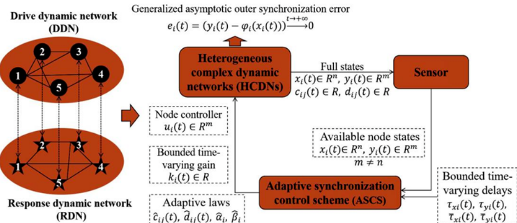 近日,英国威廉集团博士研究生李博博在数学领域国际知名期刊《Chaos, Solitons & Fractals》(影响因子5.6,中科院一区TOP)上发表题为“Adaptive-based generalized asymptotic outer synchronization control for heterogeneous complex dynamic networks with double time-varying delays”的研究成果,李博博为第一作者,指导老师钟令枢副教授为通讯作者,william威廉英国为论文第一单位。该研究针对具有未知动态连接、多维不确定参数及双重时变时延的异维复杂动态网络(HCDN)的广义渐进外同步控制问题,提出了一种由节点控制器、有界时变增益和自适应律组成的自适应同步控制方案(ASCS),使得具有不同拓扑结构的驱动-响应网络在节点间连接边完全不可利用的条件下实现了广义渐进外同步,且外同步现象涌现时网络节点间耦合连接依旧存在而非断开。该成果为复杂动态网络存在多种时延扰动、参数未知、连接不明等复杂工况下的同步调控提供了一种兼具完备性与鲁棒性的理论控制策略。